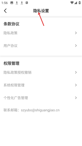 4、隱私設置板塊含條款協議和權限管理,還有聯系郵箱,全方位保障用戶隱私權益。