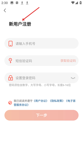 2、新用戶注冊頁需輸入手機號、獲取驗證碼,設置含數字與大小寫字母的密碼,勾選協議后點下一步注冊。