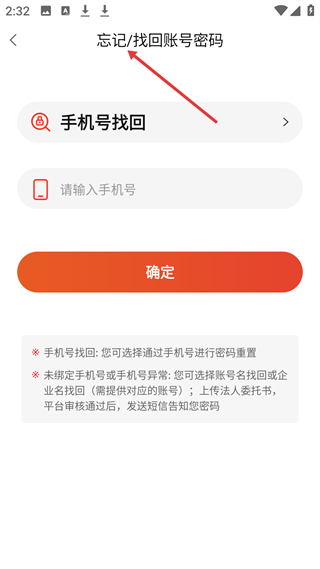 3、忘記找回賬號密碼界面,支持手機號找回,輸入手機號點確定,也可按提示用其他方式找回密碼。