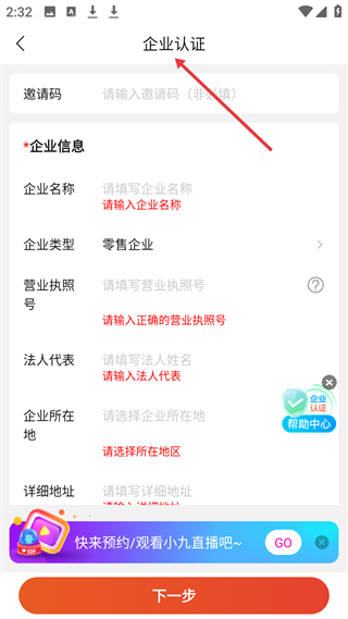 4、企業認證頁面,要填寫企業名稱、營業執照號等信息,可選填邀請碼,填好后點擊下一步完成認證。