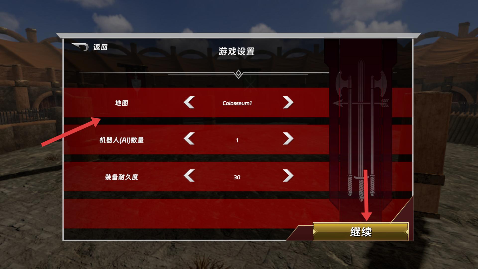 2、在游戲設置界面,設置好參數后,點擊繼續,進入武器選擇界面,挑選喜歡的武器,如丹族斧,劍等。
