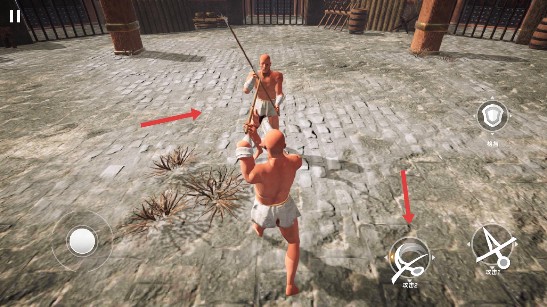 3、選好武器后,點擊繼續,進入戰斗場景,操控角色移動,利用格擋按鈕防御敵人攻擊。