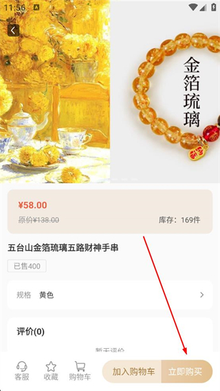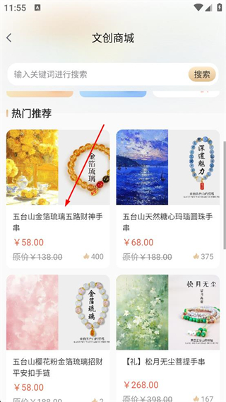 3、在文創商城熱門推薦區域,選擇五臺山金箔琉璃五路財神手串,點擊該商品,進入商品的詳情展示頁面。