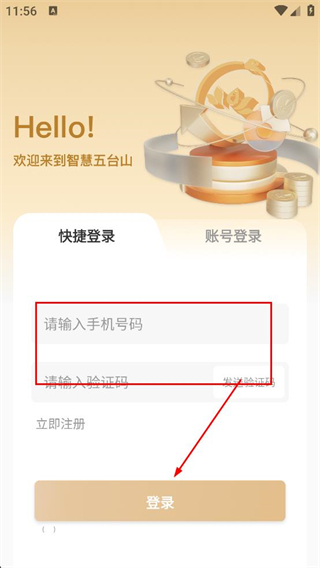 1、進入智慧五臺山登錄頁,選擇快捷登錄,在輸入框填寫手機號碼,點擊獲取驗證碼,填入驗證碼后點擊登錄按鈕,完成賬號登錄。