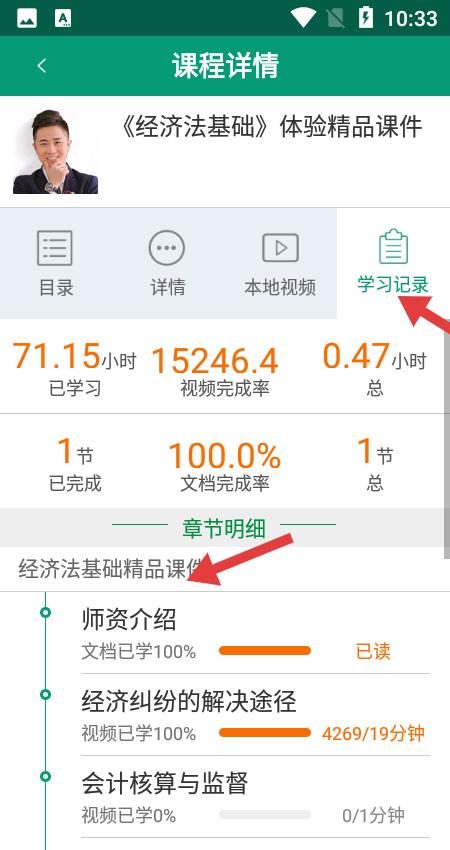 3、學習記錄界面經濟法基礎課程數據直觀,已學小時數、視頻完成率等呈現,章節明細標學習進度,幫助用戶追蹤會計課程學習成果。