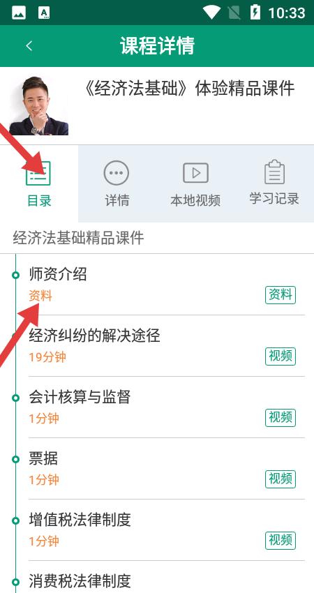 2、課程詳情頁經濟法基礎體驗課目錄清晰,師資介紹標資料,經濟糾紛等章節列視頻時長,目錄按鈕方便切換,助力用戶了解課程結構。