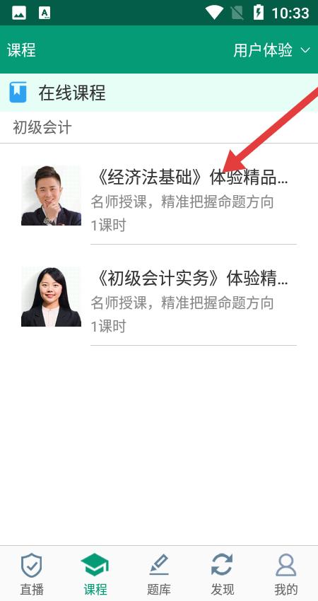 1、課程頁面展示在線課程初級會計分類下經濟法基礎體驗精品課醒目,名師授課介紹精準,1課時標注,幫助用戶挑選會計學習內容。