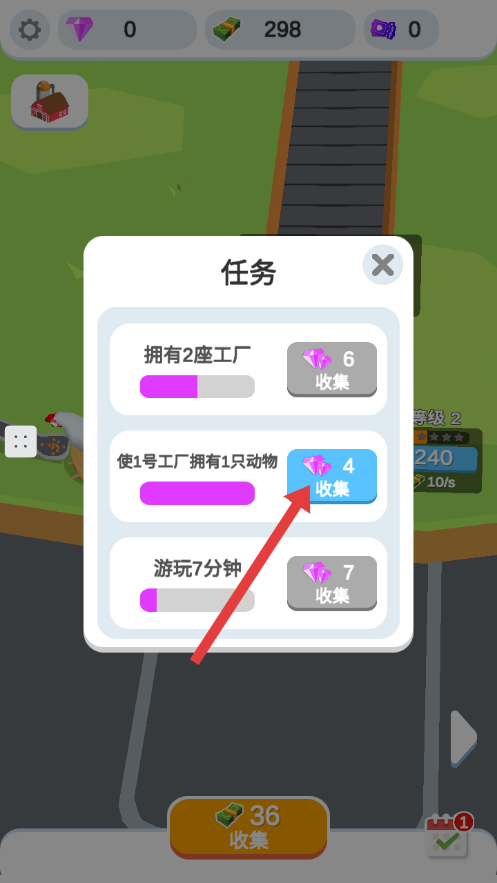 4、游戲還有任務系統,完成如讓工廠擁有動物等任務,可點擊收集按鈕,獲得鉆石獎勵,用于農場升級。