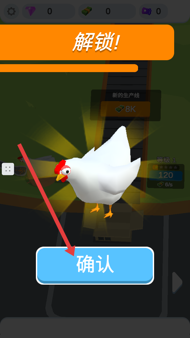 2、點擊后會解鎖新動物,屏幕出現解鎖提示,下方有確認按鈕,點擊確認,新動物就會加入農場生產。