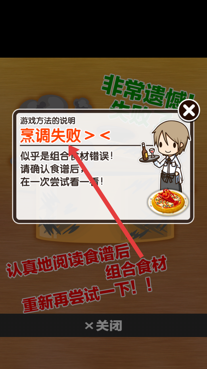 4、若食材組合或烹調方法不對,會出現烹調失敗提示,此時需查看食譜,調整食材和烹調方法,重新嘗試開發料理。