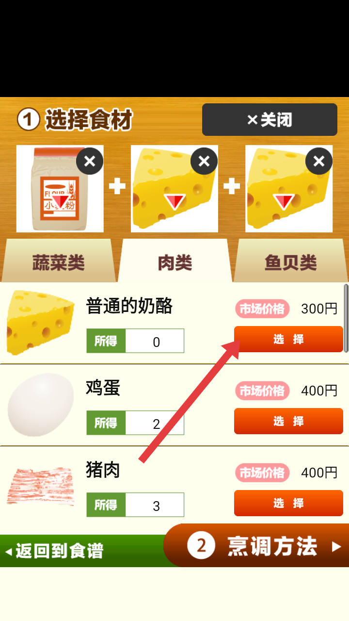 2、選擇食材環節,界面會展示各類食材,根據料理需求,點擊食材旁的選擇按鈕,挑選合適的食材用于制作。