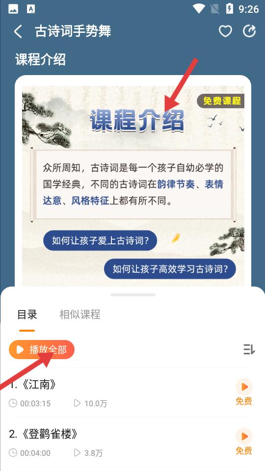 3、手勢舞課程詳情頁頂部課程介紹拋出如何讓孩子愛上、高效學古詩詞的問題,下方目錄羅列江南、登鸛雀樓等課程,每課標注時長與播放量。