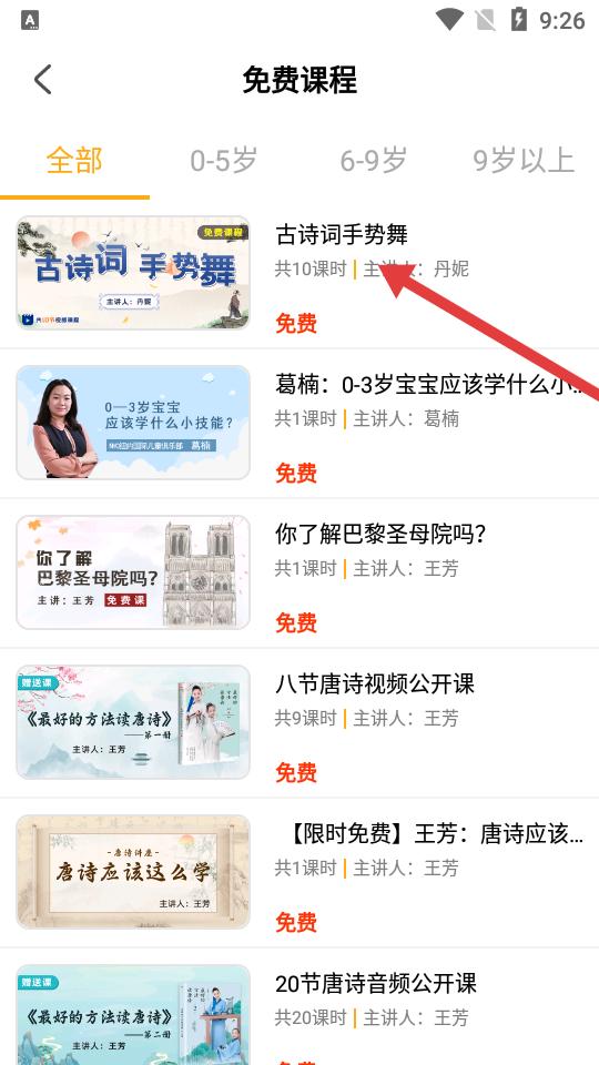 2、免費課程頁面頂部分類覆蓋全年齡段,列表陳列古詩詞手勢舞、技能課等課程,標注課時與主講人,從趣味互動到育兒知識再到文化科普。