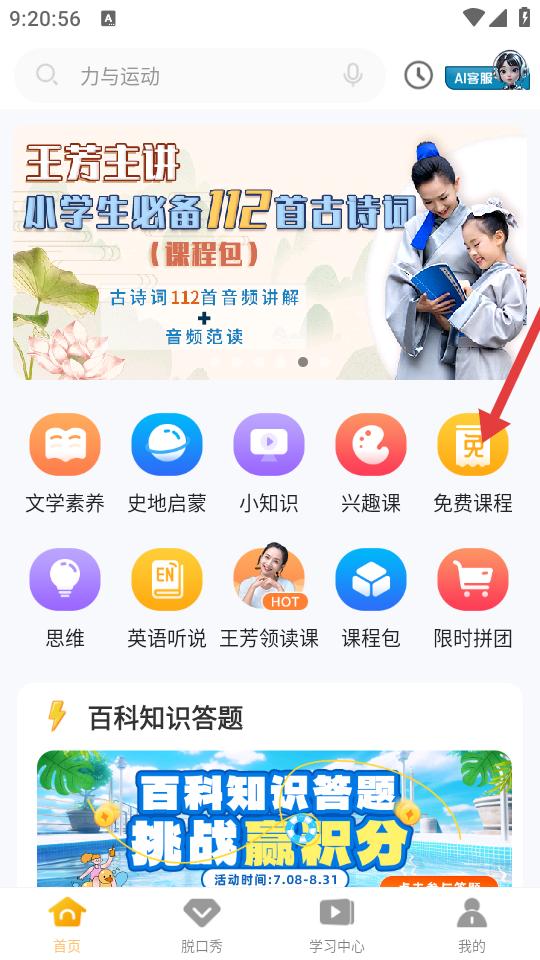 1、首頁頂部展示王芳主講的小學生必備古詩詞課程包,下方排布文學素養、史地啟蒙等功能按鈕,免費課程點擊即可學習。