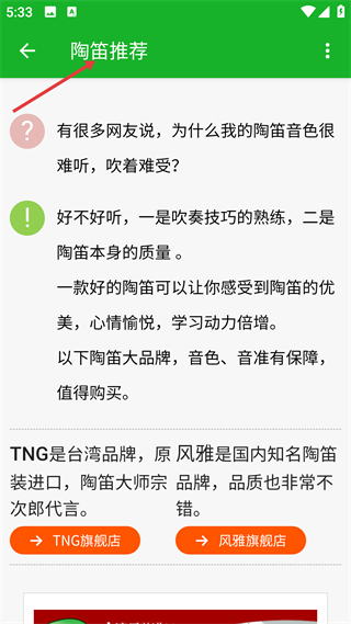 1、推薦頁面分析音色難聽的原因,關聯技巧與樂器質量,推薦TNG、風雅品牌,提供店鋪入口,是陶笛選購參考頁。