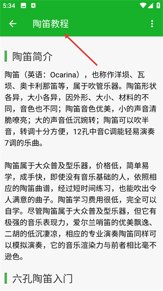 2、教程頁面介紹陶笛的類別與特點,說明其易自學且表現力強,含六孔入門內容,是陶笛學習的指引頁。