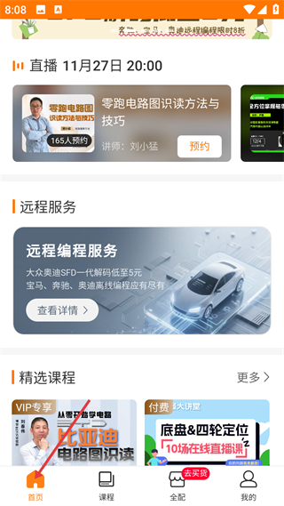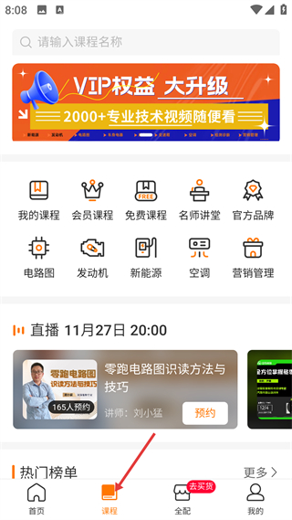 2、課程頁,提供VIP專屬、免費等分類課程,含電路圖、發動機等技術板塊,可預約直播課,底部課程是學習功能入口。