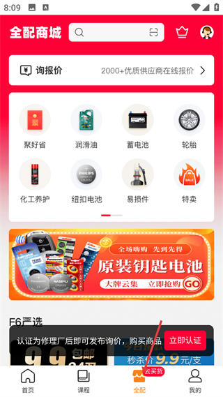 3、全配商城,售賣汽車配件與養護品,支持詢報價,設聚好省、特賣等板塊,底部全配是采購功能入口。