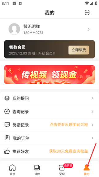 4、我的頁,管理會員、訂單等個人信息,含提問、查詢記錄功能,可參與傳視頻領現金活動,底部我的是個人中心入口。
