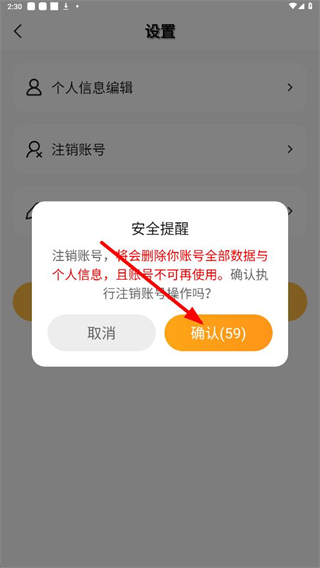 4、安全提醒彈窗中,可選擇取消或確認注銷,若確認注銷需等待倒計時結束后點擊確認按鈕,完成賬號注銷操作。