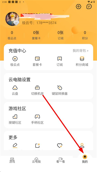 1、進入游戲平臺后,熱門標簽頁可看到多款熱門游戲,點擊我的進入個人中心,可查看極云點、套餐卡等信息,還有充值中心、云電腦設置等功能入口。