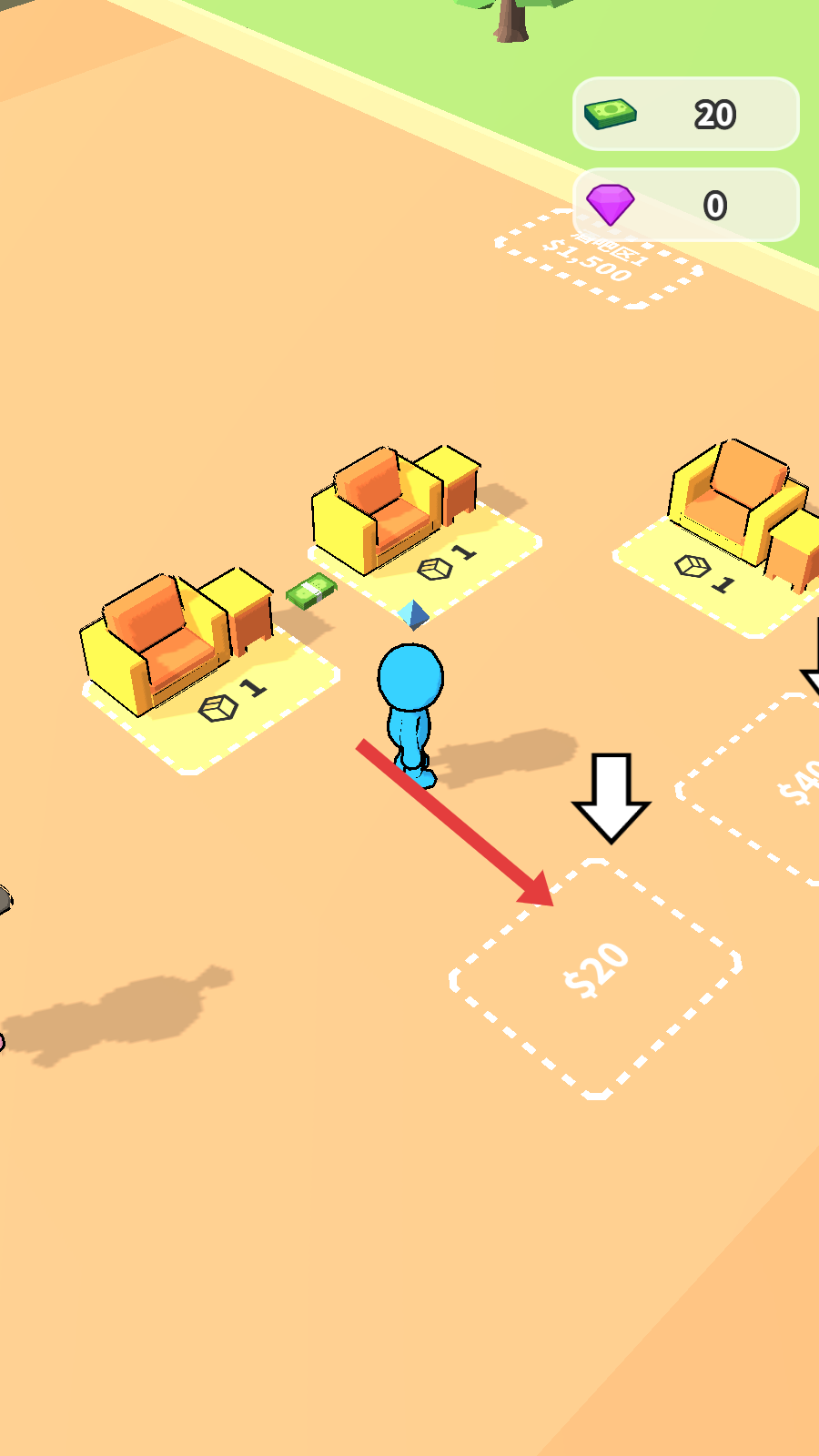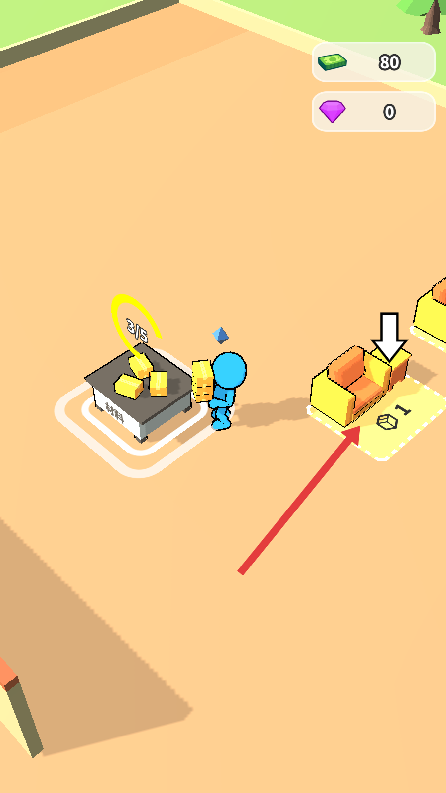 1、游戲開始,操控藍色小人從標有材料的桌子處搬運材料,將其運到沙發旁,為后續布置休閑區域準備物資。