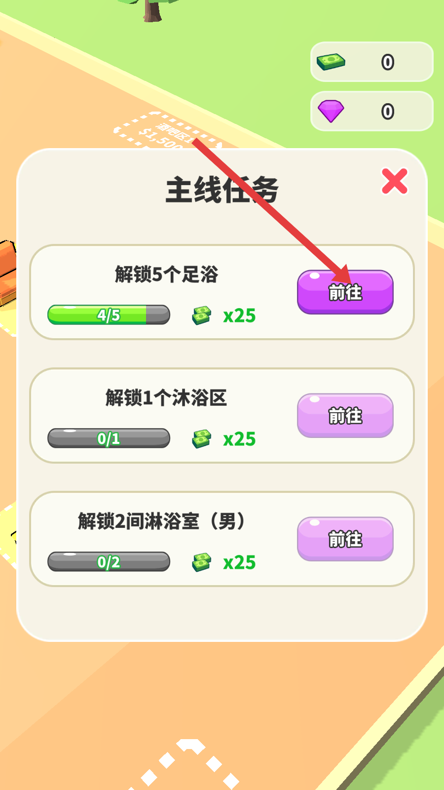 4、主線任務界面,能看到解鎖足浴、沐浴區、淋浴室等任務,點擊前往按鈕,可推進任務,完成后獲取金幣獎勵。