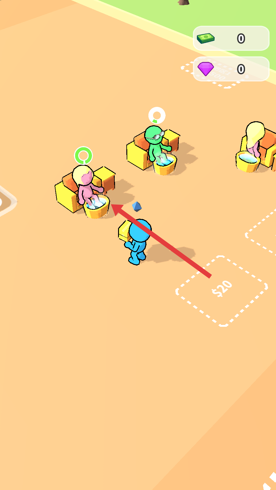 2、搬運好材料后,藍色小人把物品送到坐沙發、腳泡木桶里的顧客處,完成服務,獲取相應的金幣獎勵。