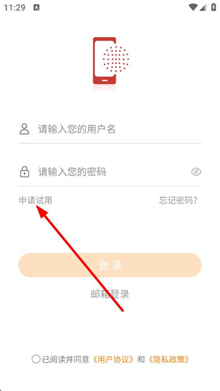 1. 進入登錄界面,可輸入用戶名與密碼完成登錄,也可選擇申請試用或郵箱登錄選項,需勾選用戶協議和隱私政策才能進行操作。