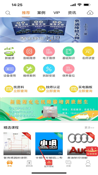 3、進入配件商城,瀏覽新能源等分類內容,參與技師認證,學習維修課程,整合汽修資源。