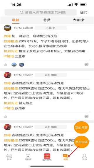 4、打開問答模塊,查看車輛故障問題,搜索或發布提問,參與故障交流,獲取技術咨詢服務。