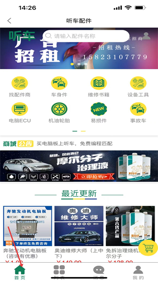 1、進入聽車首頁,可使用找配件商等服務分類,查看商城公告與最新產品,獲取汽車配件及相關服務。
