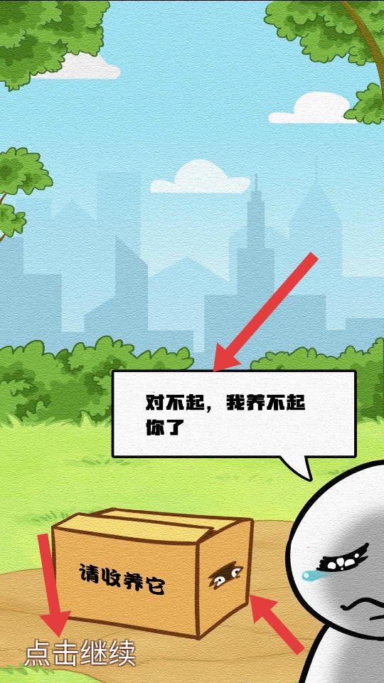 2、看到帶有請收養它字樣的紙箱和對不起,我養不起你了的對話氣泡,點擊繼續,推進游戲劇情發展。