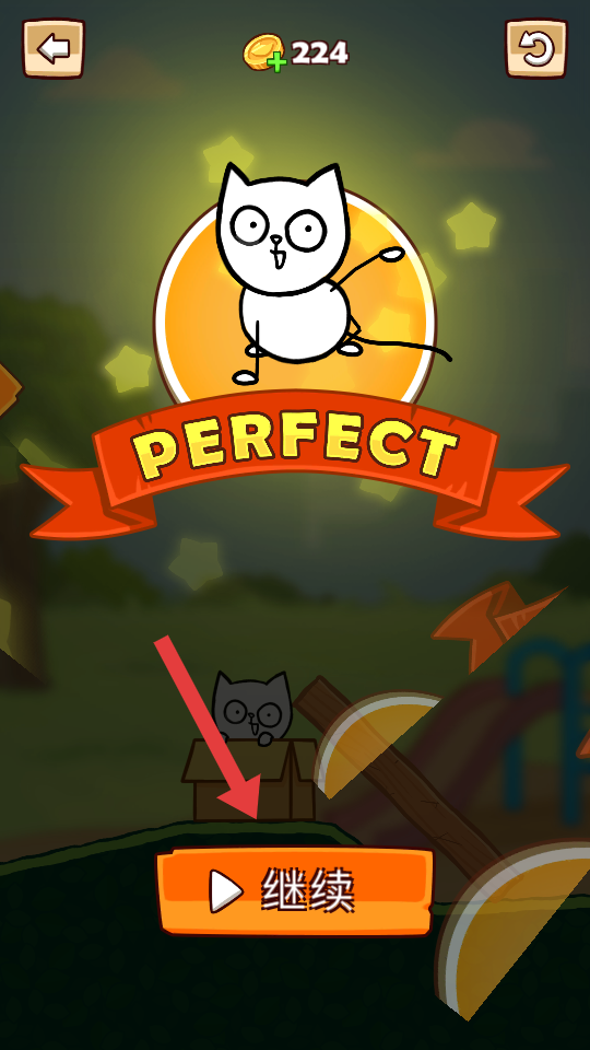 4、成功完成關卡后,界面顯示完美,點擊繼續按鈕,可進入下一個關卡,繼續拯救小貓的任務。