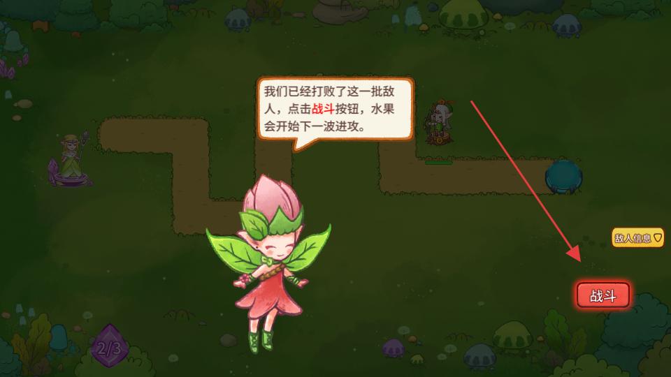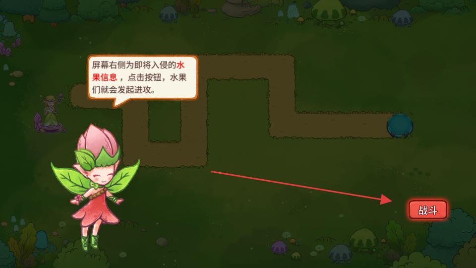 2、在游戲場景中點擊戰斗按鈕,觸發水果的進攻,然后根據提示,使用召喚牌召喚精靈,讓精靈參與到對抗水果的戰斗中。