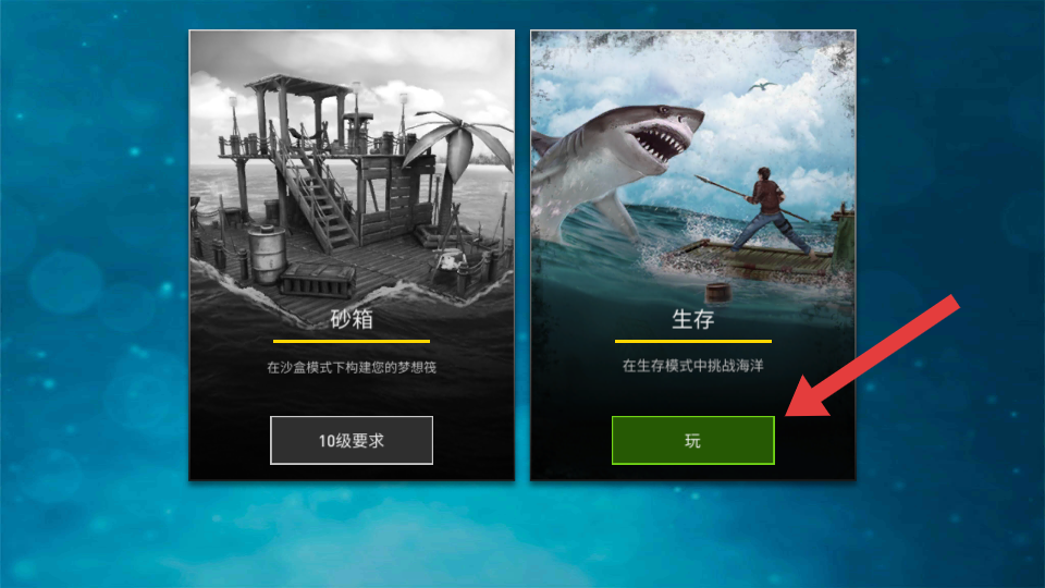 1、游戲有砂箱和生存兩種模式,砂箱需10級解鎖,點擊生存模式下的玩按鈕,即可開啟海洋生存挑戰。