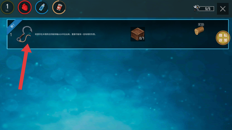 3、界面提示可使用鉤子拉取木筏附近漂浮的板條箱,箱內可能有有用物品,完成拉取任務還能獲得木頭獎勵。
