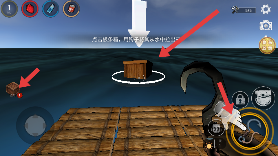 2、進入生存模式,看到水面上的板條箱,按照提示,點擊右側鉤子按鈕,準備用鉤子將板條箱從水中拉出,獲取資源。