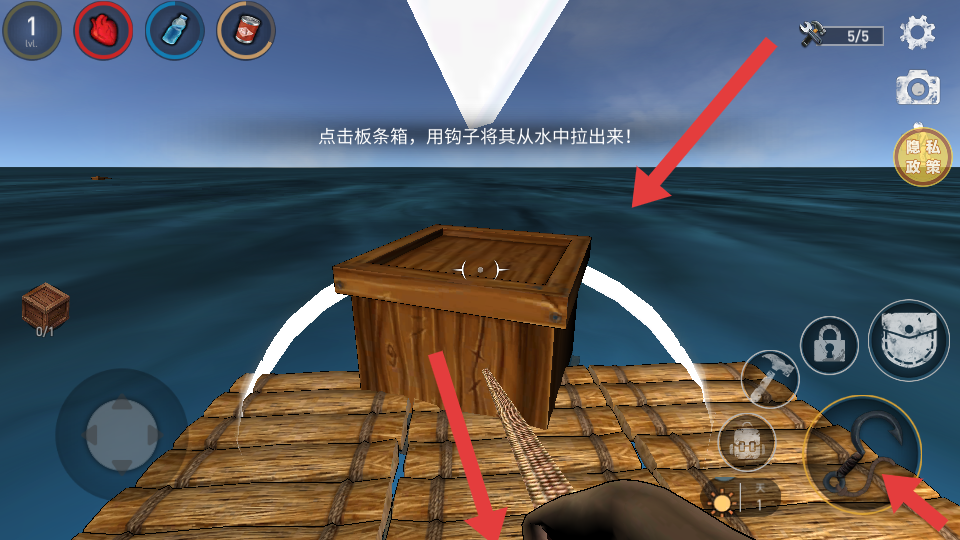 4、再次看到板條箱時,點擊右側鉤子按鈕,將鉤子投向板條箱,成功勾住后,把板條箱拉到木筏上,完成資源獲取操作。