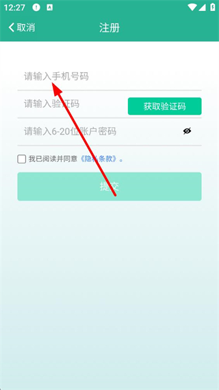 2、點擊注冊進入注冊頁面,輸入手機號碼,獲取并填寫驗證碼,設置賬戶密碼,勾選協議后點擊提交,完成賬號注冊操作。