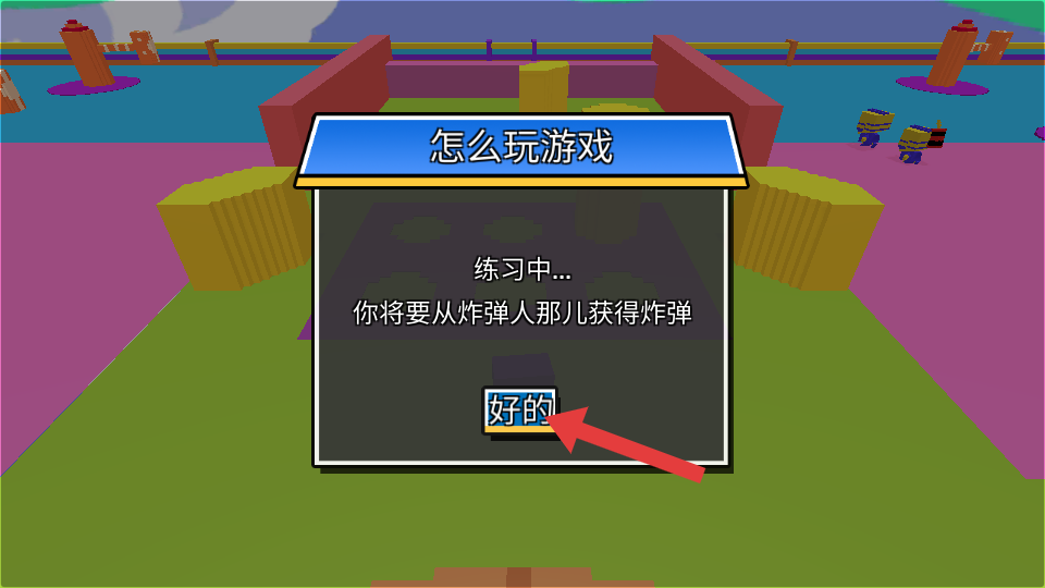 2、進入游戲后,會彈出怎么玩游戲提示框,顯示練習中,你將要從炸彈人那兒獲得炸彈,點擊好的,開始熟悉游戲玩法。