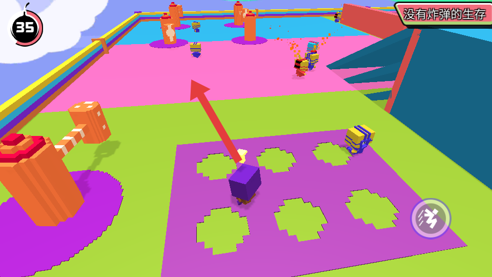 3、在沒有炸彈的生存場景,操控角色在場地內移動,躲避其他角色和危險元素,利用場景中的元素保障自身安全,堅持生存下去。