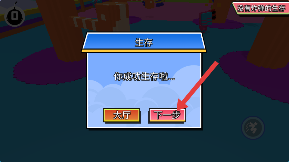 4、成功生存后,界面彈出生存提示框,顯示你成功生存啦,點擊下一步,繼續推進游戲,開啟新的挑戰環節。