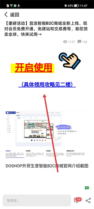3、在帖子內容中可查看開啟使用DOSHOP商城的領用攻略,了解建站、推廣等一站式外貿服務的具體信息。