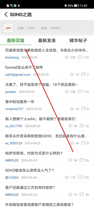 4、進入SOHO之路板塊可查看最新回復、最新發表等分類的帖子,如巴基斯坦客戶教給的人生經驗、新人做個人SOHO的疑問等。