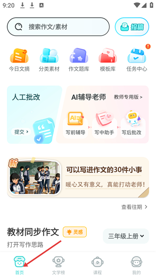 1、首頁有搜索作文素材、投稿功能,提供人工批改與AI輔導老師服務,含教材同步作文等板塊,助力打開寫作思路。