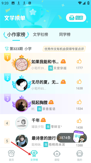 2、文學榜頁面展示小作家榜等榜單,呈現多篇優秀作文,優秀作文有機會獲專家點評,能瀏覽點贊優質作品。