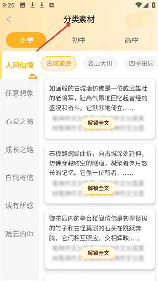 3、分類素材頁面分小學、初中、高中,小學段有古城遺跡等主題素材,可解鎖全文,為不同學段寫作提供素材支持。