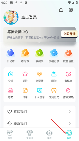 4、我的頁面可登錄,有筆神會員中心,含日記本、練習本等功能,還有空間、文學社等社交及個人管理相關入口。