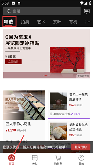 2、首頁,設精選等分類,展示展覽周邊、手作好物并標注折扣,底部有功能導航,提示登錄可領取新人優惠。